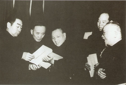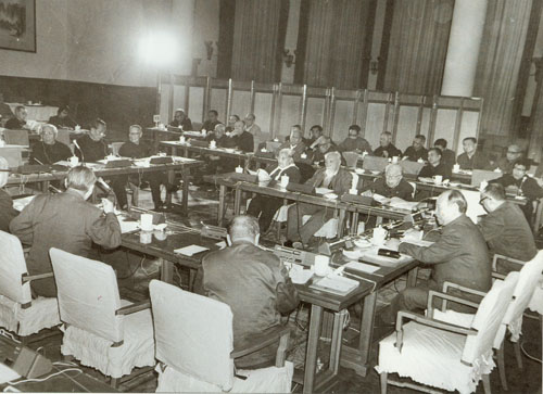 76.彭真1953.2在政协第一届全国委员会第四次会议期间参加研究会议文件。左起:周恩来、郭沫若、邓小平、彭真、李济深。