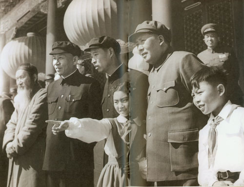 35.彭真1950.5.1在天安门城楼上,欢庆五一劳动节。左起:彭泽民、吴玉章、聂荣臻、林伯渠、蔡廷锴、刘少奇、萧华、谭平山、朱德、张奚若、彭真。