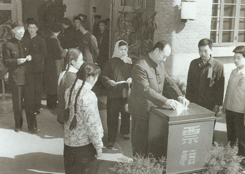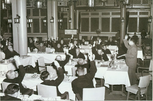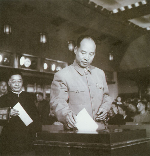 81.彭真1954.9.20在第一届全国人大一次会议投票通过《中华人民共和国宪法》。左为舒舍予(老舍)。
