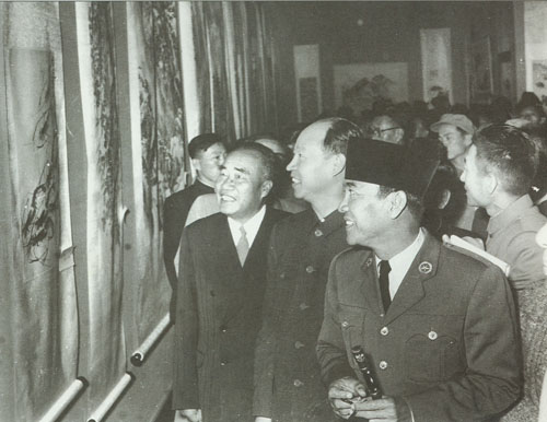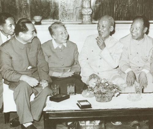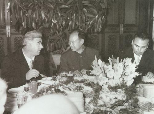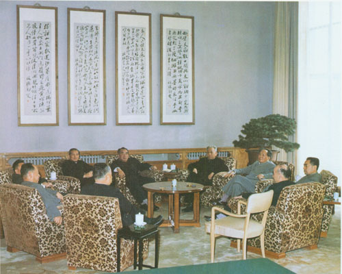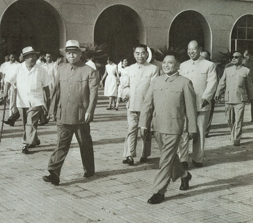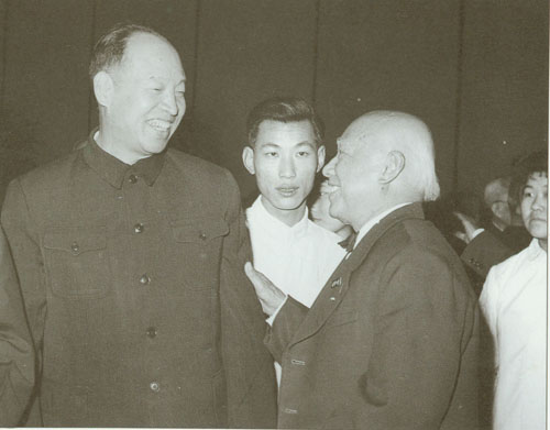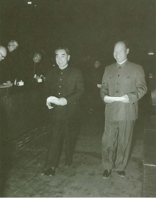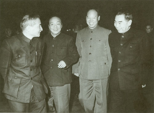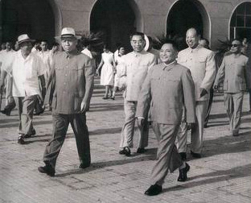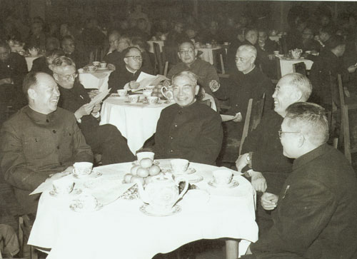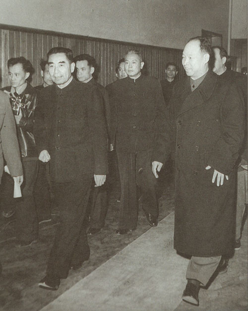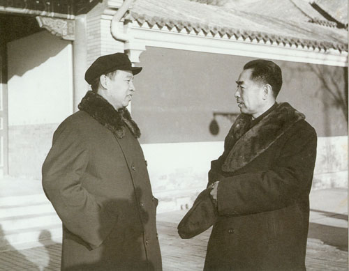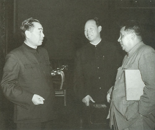 87.彭真1955.10在中共七届六中全会期间同周恩来、廖承志在一起。
