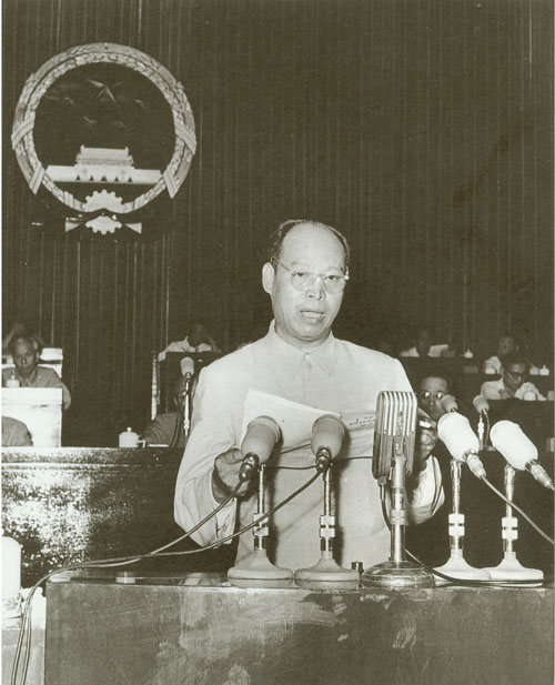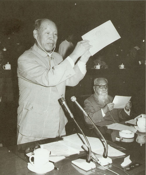 270.彭真1984.11主持六届全国人大常委会第八次会议,听取国务委员兼外交部长吴学谦(右一)就提请审议中英关于香港问题协议文件所作的报告。