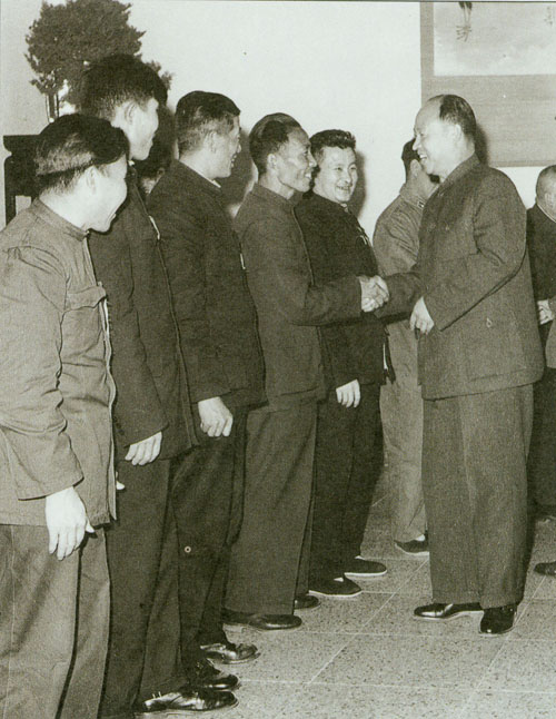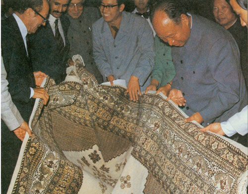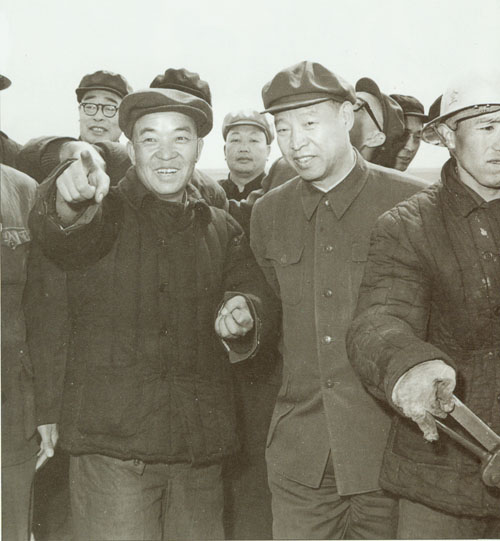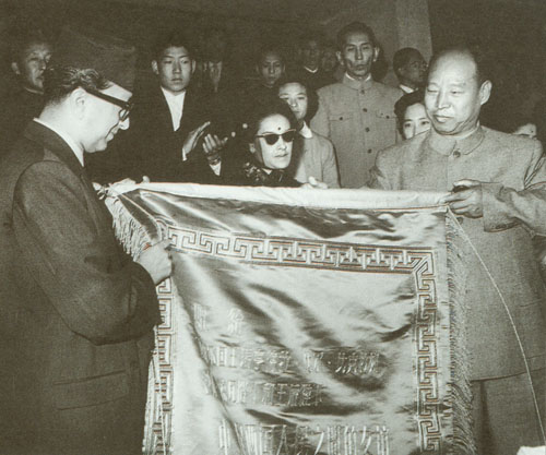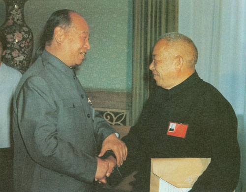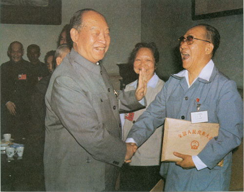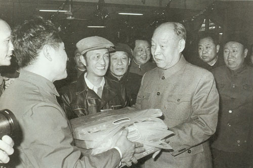 292.彭真1985.12在石家庄车辆工厂接受职工赠送的纪念画册。六十年前,这里是正太铁路石家庄总机厂,彭真 曾在这里领导过工人运动。