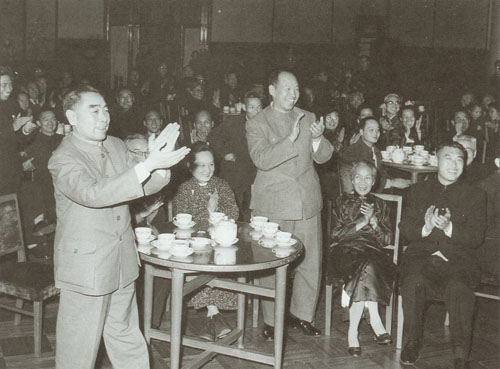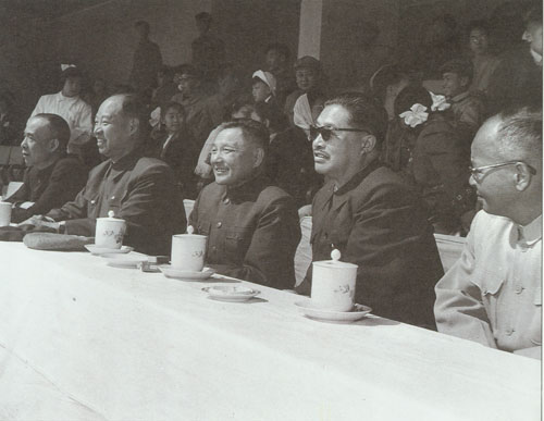 80.彭真1954.8在北京市第一届人民代表大会第一次会议上当选为全国人民代表大会代表。前排左起:彭真、周恩来、毛泽东、刘少奇。