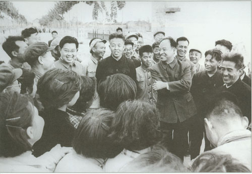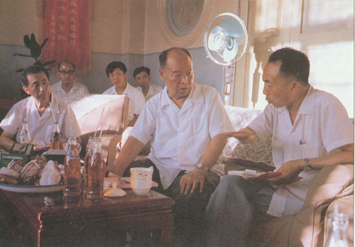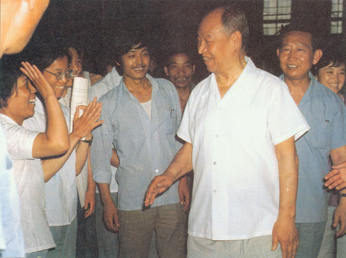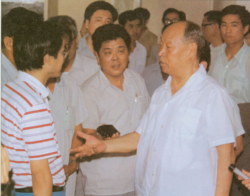 307.彭真1986.6在河南视察郑州电缆厂,与工人交谈。
