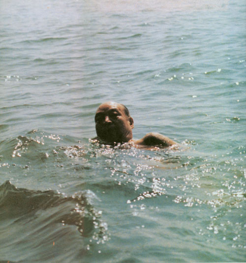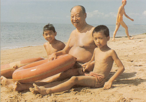 313.彭真1986年与孙儿们在北戴河游泳。