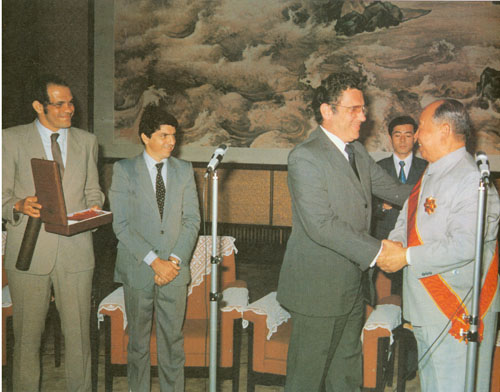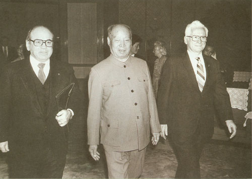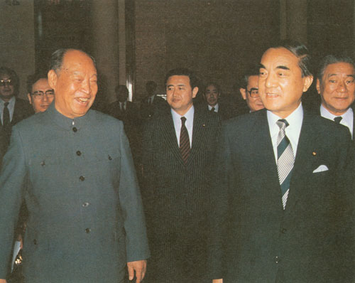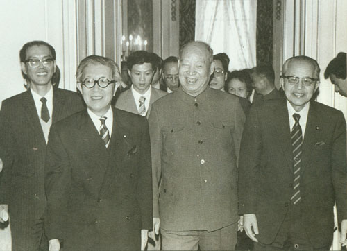280.彭真1985.4与日本国众议院议长坂田道太(前左)、参议院议长木村睦男(前右)在一起。