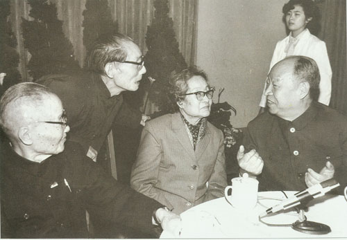 276.彭真1985.3同政协六届全国委员会副主席茅以升(左一)、赵朴初(左二)、王光英(左三)交谈。