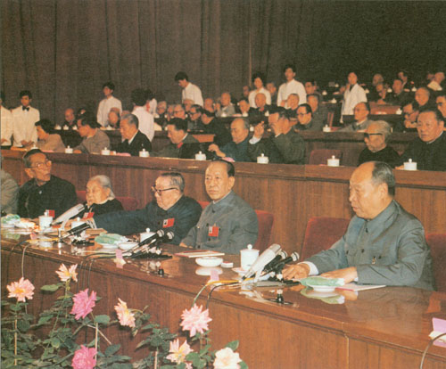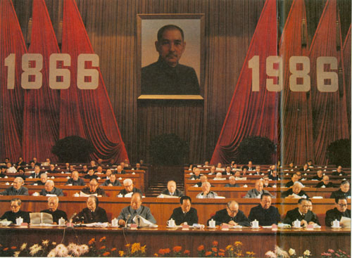 309.彭真1986.11.12在首都各界纪念孙中山先生诞辰一百二十周年大会上讲话。主席台前排左起:方毅、万里、邓颖超、彭真、胡耀邦、乌兰夫、习仲勋、黄文欢、乔石。