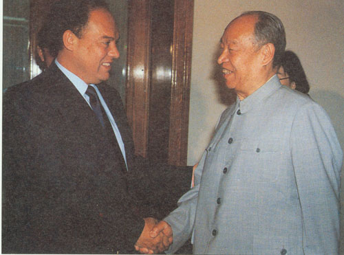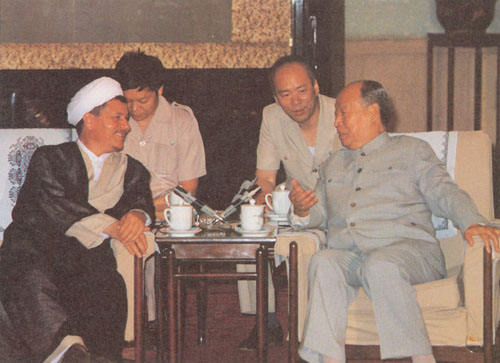 282.彭真1985.6在北京会见伊朗议长哈什米·拉夫桑贾尼。