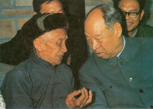 324.彭真1987.4在井冈山同红军老战士陈春林交谈。