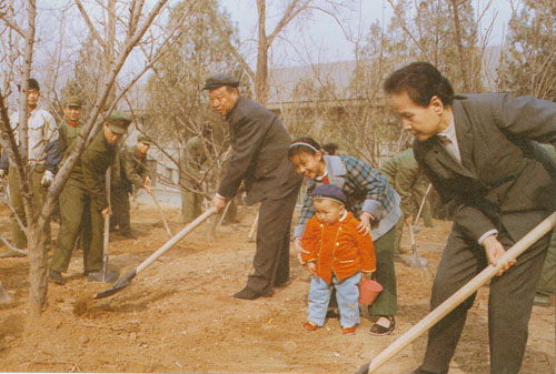 343.彭真1987年和夫人张洁清同解放军战士一起植树。