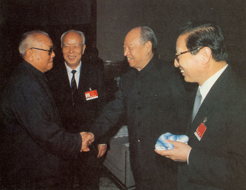 356.彭真1990年春节前夕,与来看望的江泽民、李鹏。