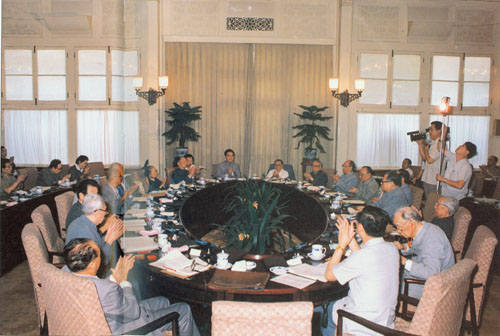 350.彭真1989.5.26受中共中央委托,邀请七届全国人大常委会党外副委员长座谈,就首都发生的严重动乱讲 话,指出必须以宪法和法律为准绳统一思想。前排左起:朱学范、周谷城、彭真、严济兹、雷洁琼。后排左三荣毅仁、左四费孝通、左五孙起孟。
