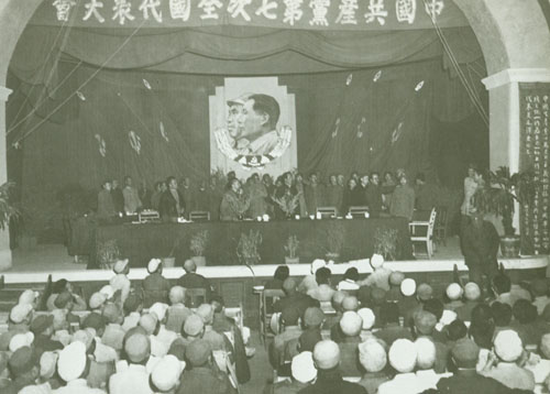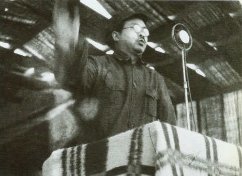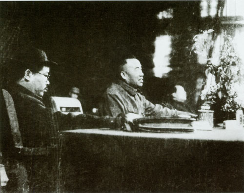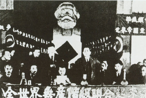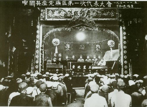 32.任弼时1931.11.1-5出席在江西瑞金叶坪召开的中国共产党苏区第一次代表大会。主席台右一为任弼时。