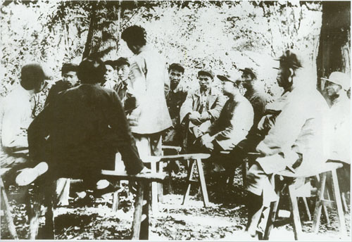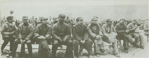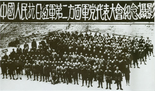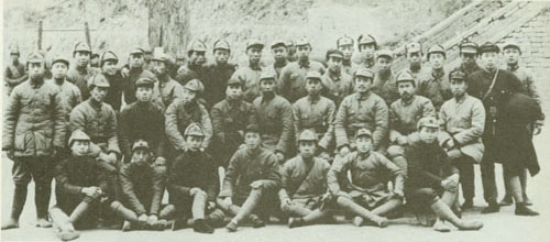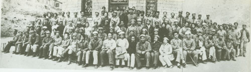 46.任弼时1937.3.8在陕西铜川陈炉镇召开的中共红二方面军党代表大会上作《目前形势及我们政治上的任务》的报告,并与大会代表合影。一排右起:贺龙、关向应、任弼时。