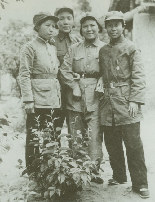 43.任弼时夫人陈琮英(左一)1936年长征到达陕北后与蔡畅(左二)、刘英(左四)等女红军合影。