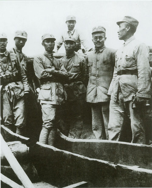 54.任弼时1937.9.15与八路军总部在陕西韩城县芝川镇东渡黄河开赴山西抗日前线。左起:左权、任弼时、朱德、邓小平等。