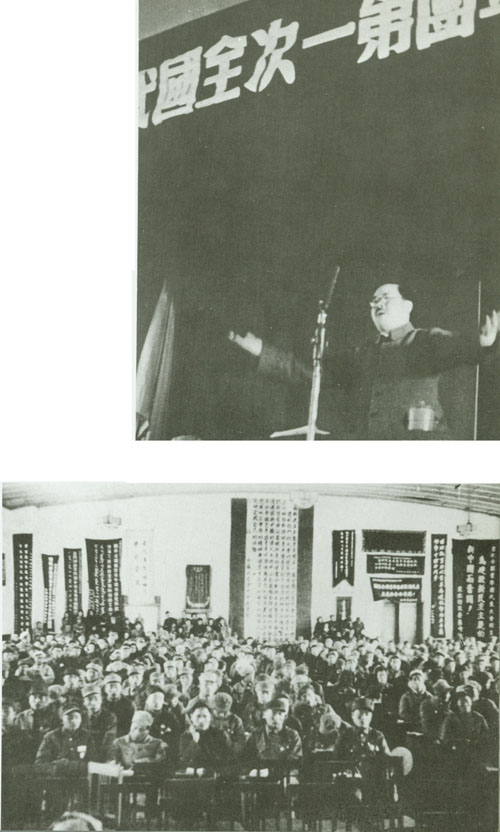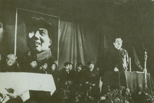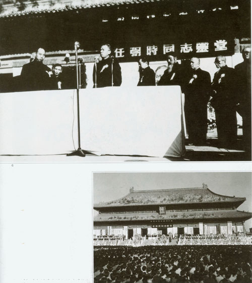 266.任弼时追悼大会1950.10.30在劳动人民文化宫举行,首都各界群众四万多人参加,刘少奇代表中共中央讲话。大会主席台左起:彭真、陈云、刘少奇、周恩来、张澜、李济深、陈叔通、刘伯承。