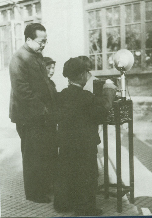 202.任弼时1949年冬观赏照相机。