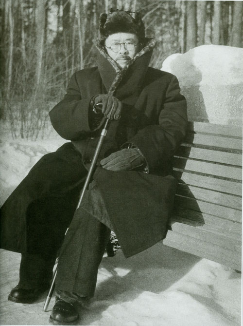 224.任弼时1950.1在苏联巴拉维赫疗养院林中散步小憩。