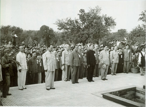 267.任弼时遗体安葬仪式1951.7.18在北京八宝山公墓隆重举行。前排左二起:彭真、朱德、刘少奇、周恩来;后排左起:杨尚昆、董必武、陈云、吴玉章、李富春。
