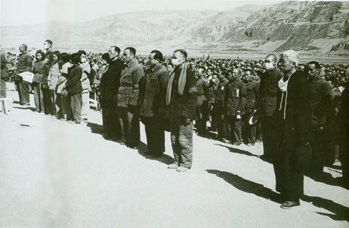78.任弼时1940.3.26结束中共驻共产国际代表的工作,与周恩来等一起回到延安。延安各界举行欢迎大会。大会主席台左起:陈琮英、蔡畅、任弼时、周恩来、毛泽东、李富春。